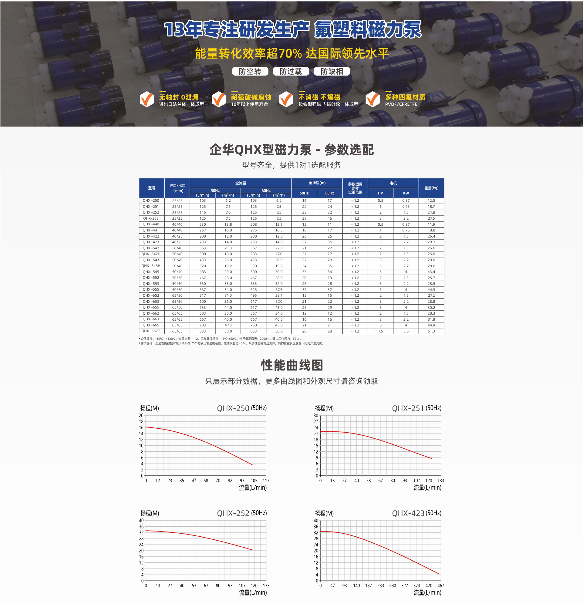 耐強腐蝕,進出口法蘭一體成型專利滴水不漏;采用欽鐵硼高效強磁不消磁,內磁葉輪體成型不爆磁;多種泵頭材質、流量大震動小、噪音低,可另配“智能三防保護裝置”,拒絕空轉損壞。